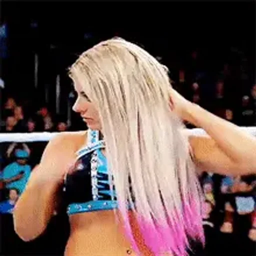 Mulher loira com cabelo rosa no fundo, usando um top preto e azul, em um ringue de luta.