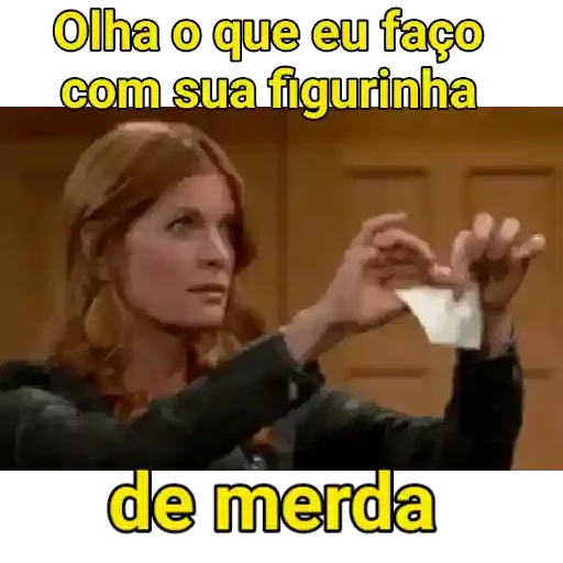 Uma mulher loira fazendo uma careta enquanto rasga uma figurinha com as mãos. O texto 'Olha o que eu faço com sua figurinha de merda' aparece em amarelo sobre a imagem.