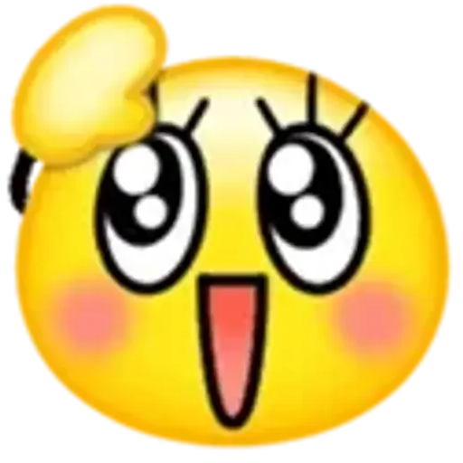 Rosto de emoji amarelo com expressão de surpresa, bochechas rosadas e um laço amarelo no cabelo. Boca aberta e olhos arregalados.