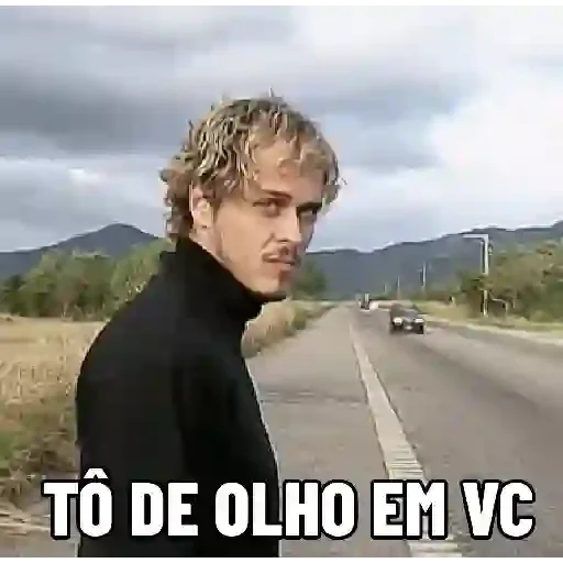 Homem loiro com expressão séria, vestindo um suéter preto, olhando para trás em uma estrada com montanhas ao fundo. Texto: 'TÔ DE OLHO EM VC'