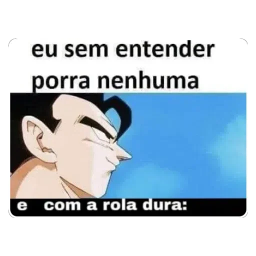 Um personagem de anime com expressão confusa e braço erguido, com texto 'eu sem entender porra nenhuma e com a rola dura:'