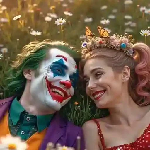 Um casal em um campo de flores, com o Joker ao lado de uma mulher, ambos sorrindo. O Joker tem maquiagem colorida e cabelo verde, enquanto a mulher usa um vestido vermelho e uma coroa de flores.