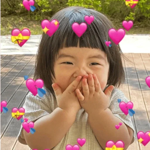 Menina com as mãos na boca e corações rosa ao redor.