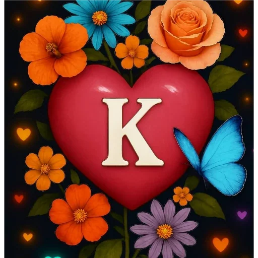 Um coração vermelho brilhante com a letra 'K' em branco, cercado por flores coloridas, incluindo laranjas, azuis e roxas, e um borboleta azul, em um fundo preto com pequenos corações e estrelas.