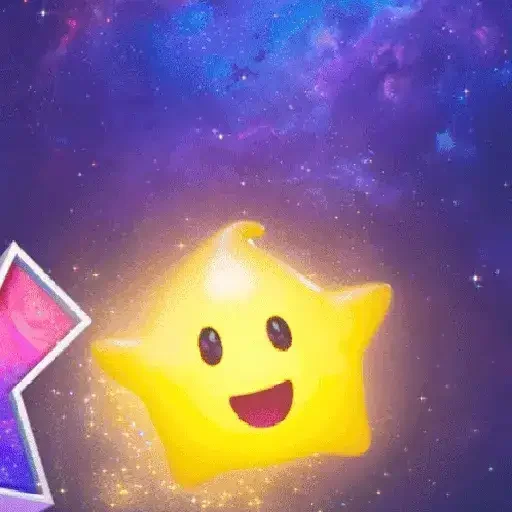 Uma estrela amarela sorridente com olhos pretos e fundo estrelado roxo e azul.