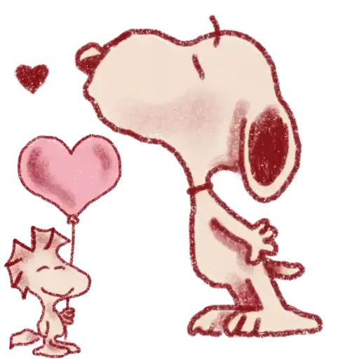 Snoopy e Spike com um balão em forma de coração e um coração no ar.