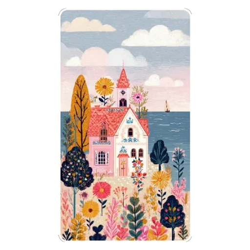 Uma casa colorida com telhado rosa e torre, cercada por flores e árvores, com o mar ao fundo e nuvens no céu.