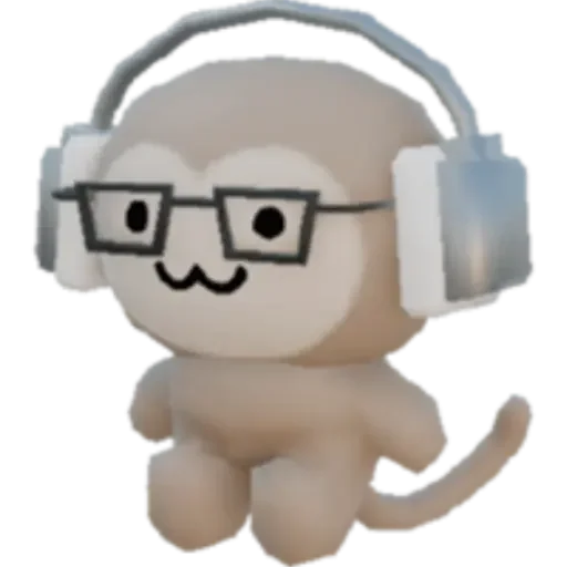 Um macaco de pelagem bege usando óculos de armação preta e fones de ouvido brancos, com um sorriso no rosto.
