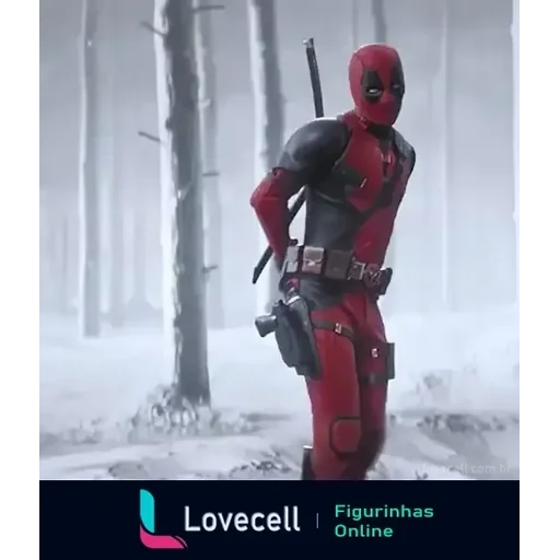 Deadpool, o personagem de quadrinhos, usando máscara vermelha e traje de couro, com duas espadas nas costas.