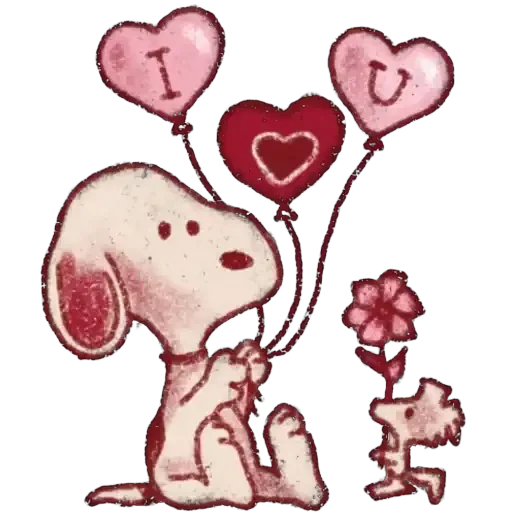 Snoopy e Woodstock com balões de coração e uma flor, expressão fofa.