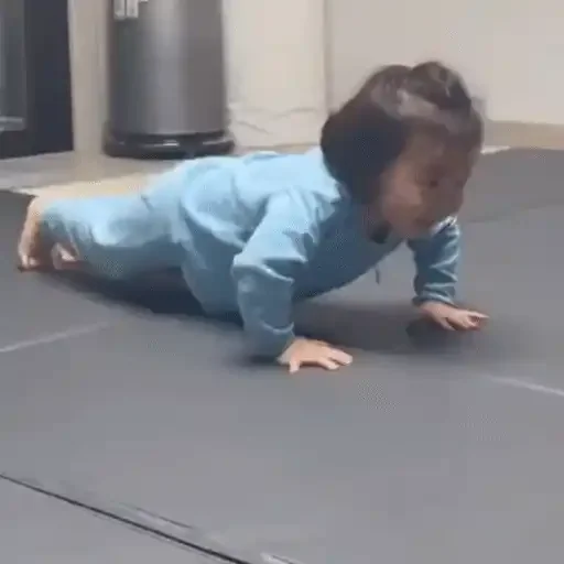 Menino deitado de bruços em um tatami, vestindo uma camisa azul, com as mãos posicionadas para fazer flexões.