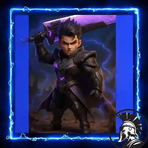Um homem com armadura preta empunha uma espada roxa em um fundo escuro com raios roxos.