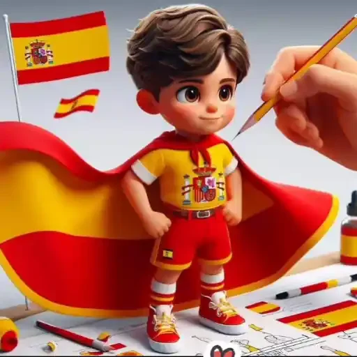 Menino com capa e bandeira da Espanha, vestindo uma camisa amarela com uma logo colorida, calças vermelhas e sapatos vermelhos com amarelo, sendo pintado por uma mão com um pincel.
