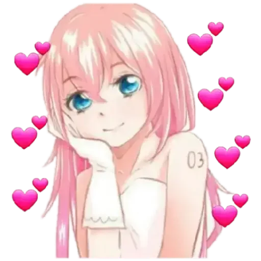 Uma garota de anime com cabelo rosa e olhos azuis sorri com a mão no queixo, rodeada de corações rosa e vermelhos.