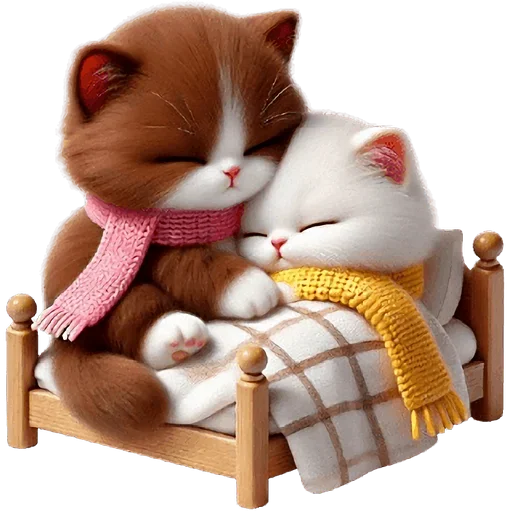 Dois gatos fofos, um castanho e um branco, abraçados e dormindo em uma cama pequena. O gato castanho usa um cachecol rosa.