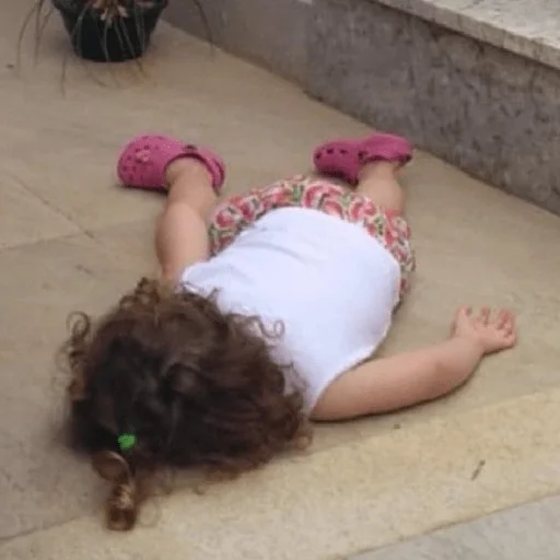 Menina deitada de bruços no chão, com cabelo castanho e chinelos rosa. Ela está vestida com uma blusa branca e uma saia rosa.
