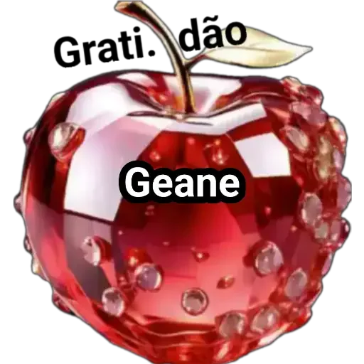 Uma maçã vermelha brilhante com gotículas de água, texto 'Grati. dão' e 'Geane' sobreposta.