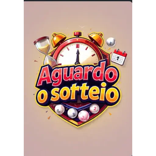 Uma figurinha com um relógio e bolas de loteria, com o texto 'Aguardo o sorteio' em letras coloridas.