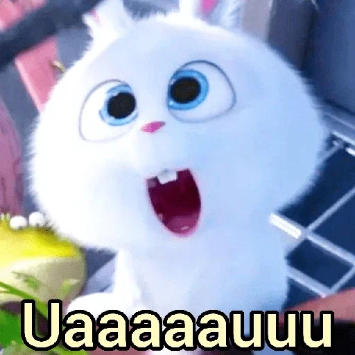 Um coelho branco e fofo com olhos azuis e boca aberta, parecendo surpreso ou assustado. Abaixo dele, está escrito 'Uaaaaauuuu'.