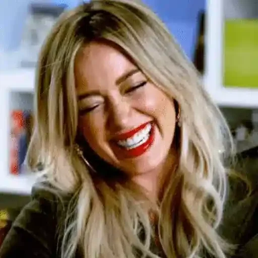 Mulher loira com sorriso largo e olhos fechados, maquiagem discreta e cabelo ondulado, parecendo feliz ou rir de algo.