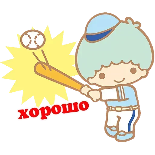 Um menino com cabelo verde claro e um boné azul está prestes a bater em uma bola de beisebol com um taco. A palavra 'хорошо' está escrita em vermelho abaixo dele.