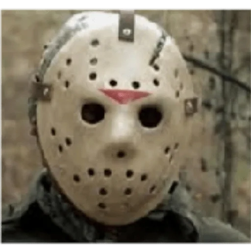 Máscara branca com furos e uma faixa vermelha triangular no centro, cobrindo o rosto de uma pessoa. A máscara tem uma aparência assustadora.