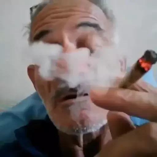 Um homem mais velho com um cigarro na mão, soltando fumaça pela boca. Ele tem cabelos grisalhos e uma expressão relaxada.