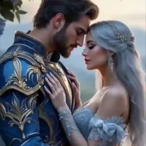 Um casal de jovens apaixonados, com o homem de cabelos castanhos e barba, vestindo uma armadura azul e dourada, e a mulher de cabelos grisalhos longos, com vestido azul claro, se beijando suavemente.