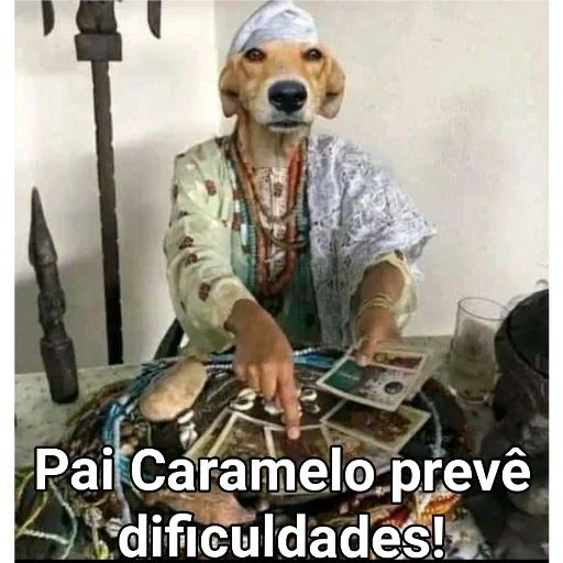 Um cachorro vestido com roupas coloridas e acessórios, parecido com um pai de santo, sentado em frente a um tabuleiro com objetos, com a frase 'Pai Caramelo prevê dificuldades!'