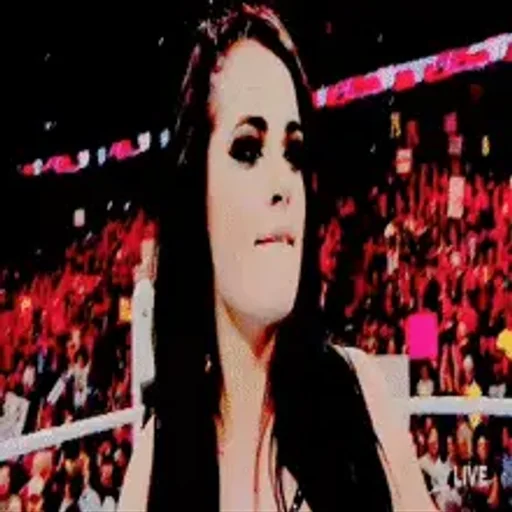 Mulher com cabelo preto e maquiagem pesada em um evento lotado, possivelmente um ringue de luta livre, com o texto 'LIVE' no canto inferior direito.