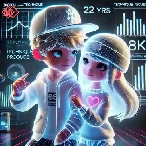 Um casal de personagens de anime com aparência futurista, com gráficos de tecnologia ao fundo. O homem usa um boné e uma jaqueta branca, enquanto a mulher usa um capacete e uma camiseta com um coração rosa.