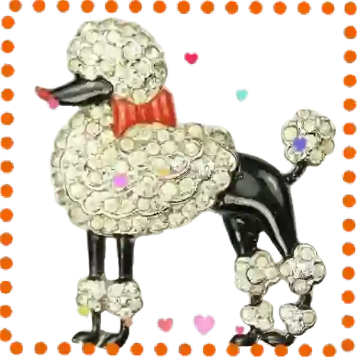 Um cachorro poodle branco com um laço vermelho, decorado com corações coloridos.