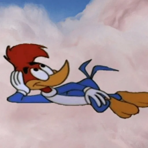 Um pato cartoon deitado de bruços em um fundo de nuvens brancas e céu azul, com expressão relaxada.