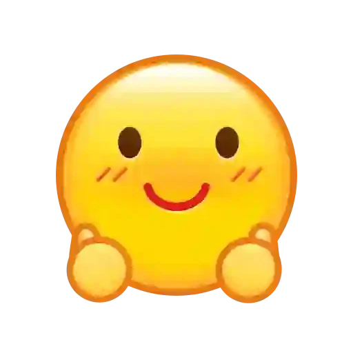 Um emoji amarelo sorridente com bochechas rosadas e olhos castanhos, sentado com as mãos no chão.