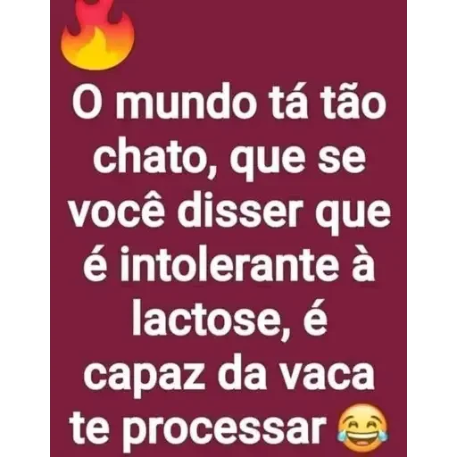 Uma figurinha com texto em português que diz 'O mundo tá tão chato, que se você disser que é intolerante à lactose, é capaz da vaca te processar'. A imagem tem fundo marrom escuro, com um emoji de chamas no canto superior esquerdo e um emoji de rosto rindo no canto inferior direito.