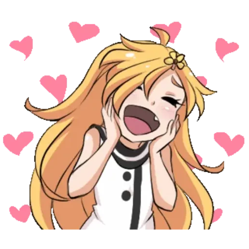 Uma garota de cabelo laranja com as mãos no rosto e coraçãozinhos rosa ao redor, parecendo feliz e apaixonada.