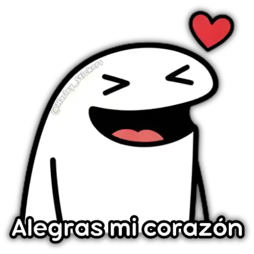 Um personagem de desenho animado com um sorriso largo e olhos fechados, parecendo feliz. Há um coração vermelho acima de sua cabeça e o texto 'Alegras mi corazón' abaixo.