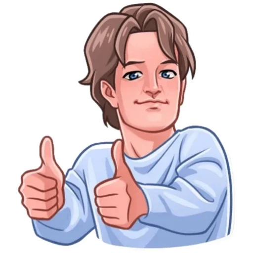 Um jovem com cabelo castanho e olhos azuis dá dois polegares para cima, vestindo uma blusa azul clara.