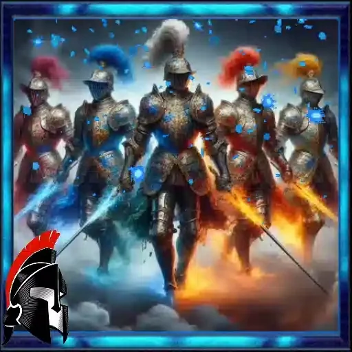 Dois cavaleiros de armadura segurando uma espada acesa com chamas laranja, cercados por um quadro azul com estrelas…