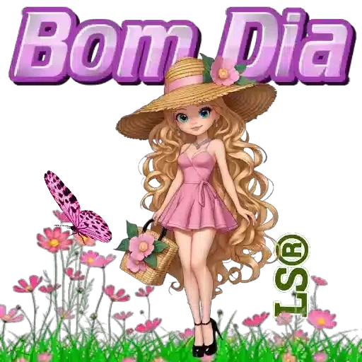 Uma mulher de cabelos loiros longos e chapéu de palha sorri em um campo de flores rosadas com uma borboleta, segurando uma bolsa. 'Bom Dia' está escrito acima dela.