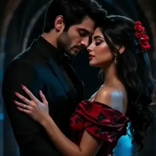 Um casal se beijando, com o homem de camisa preta e a mulher de vestido vermelho e adorno de flores no cabelo.