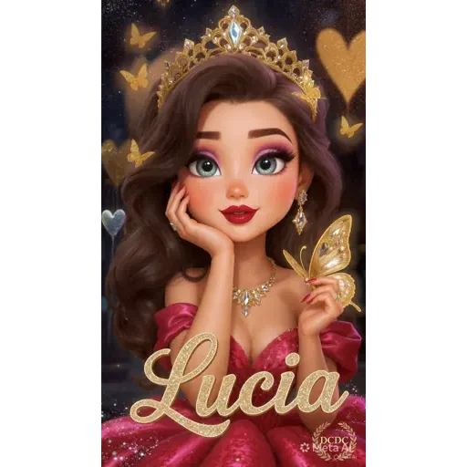 Uma princesa de cabelo castanho e olhos azuis, usando uma coroa dourada e um vestido rosa. Ela está com a mão no rosto e segurando uma borboleta dourada, com o nome 'Lucia' em letras douradas na frente.