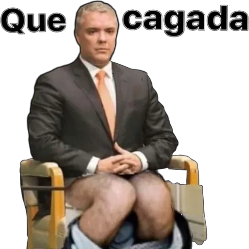 Homem de meia-idade, careca, de terno e gravata laranja, sentado em uma cadeira com as pernas abertas e sem calças. 'Que cagada'