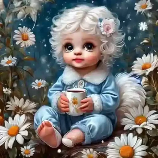 Menina bebê com cabelo branco encaracolado e flor no cabelo, vestida com pijama azul, sentada entre margaridas, segurando uma xícara.