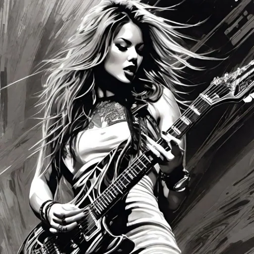 Uma mulher loira com cabelos longos e ondulados está tocando guitarra. Ela tem uma tatuagem no ombro e está vestida com uma blusa e calças.