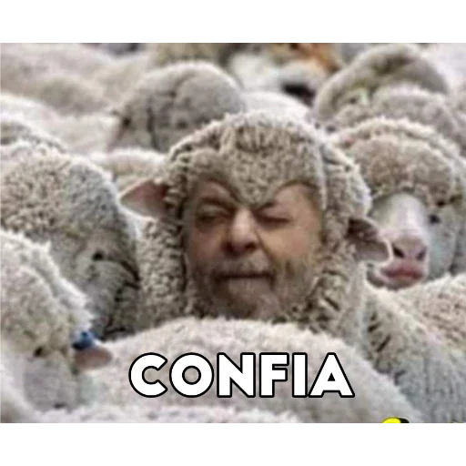 Um homem com o rosto sério, vestido com uma roupa de cordeiro, está no meio de um rebanho de ovelhas. A palavra 'CONFIA' está escrita abaixo dele.