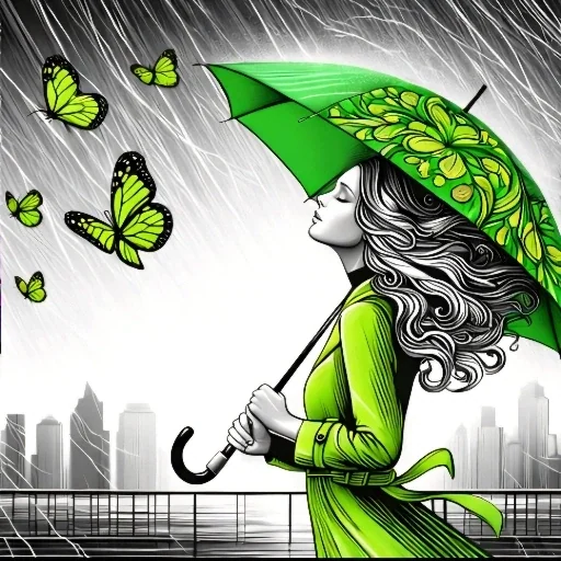 Mulher com guarda-chuva verde olhando borboletas voarem em uma chuva, com uma paisagem urbana ao fundo.