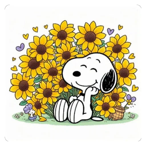 Snoopy sorrindo e deitado em um campo de girassóis com corações ao redor.