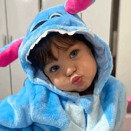 Bebê vestindo uma roupa de pelúcia azul de Stitch, com orelhas rosa, fazendo careta.
