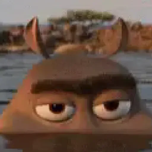 Rosto de um personagem de desenho animado com expressão séria e olhos arregalados, fundo desfocado com aparência de cenário natural.